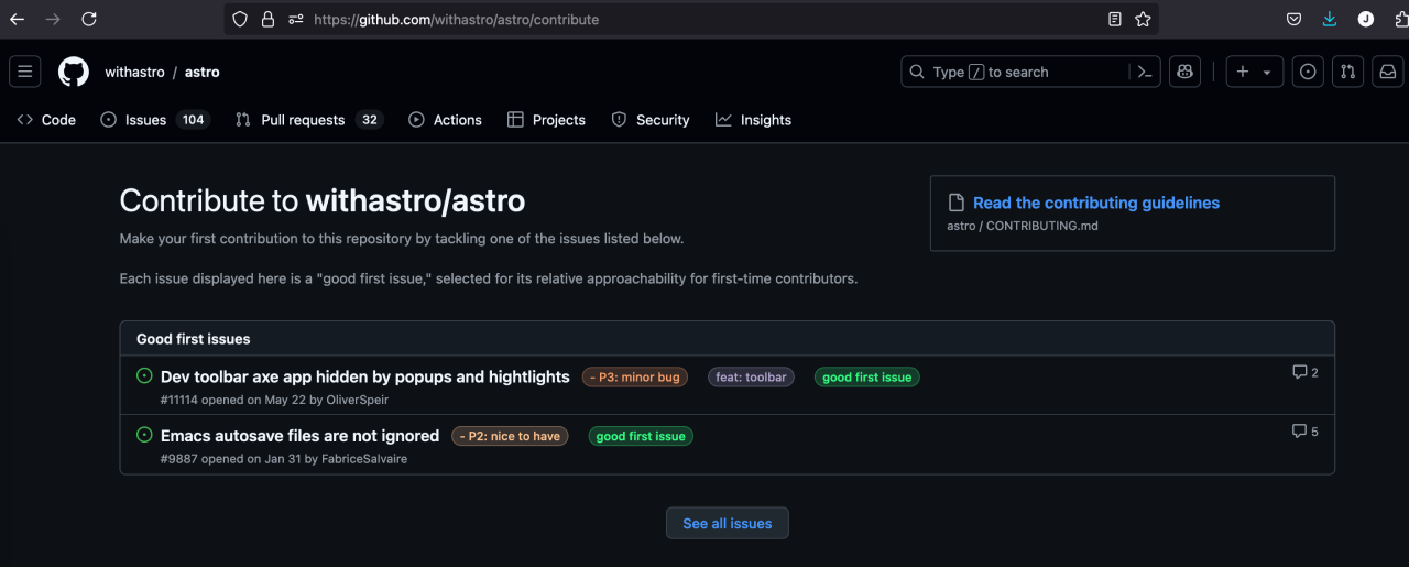 to the repository URL. For instance, the “Contribute” page for the Astro repository can be found at https://github.com/withastro/astro/contribute.